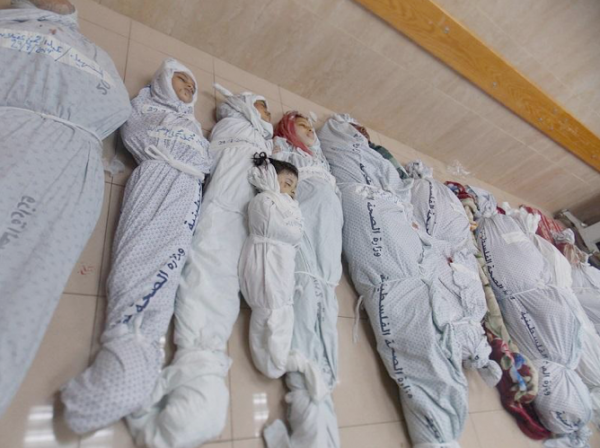 Bambini uccisi durante la macellazione sionista a Gaza 2014. Foto scattata all'ospedale dei Martiri di Al Aqsa, Deir Al Balah, striscia di Gaza.