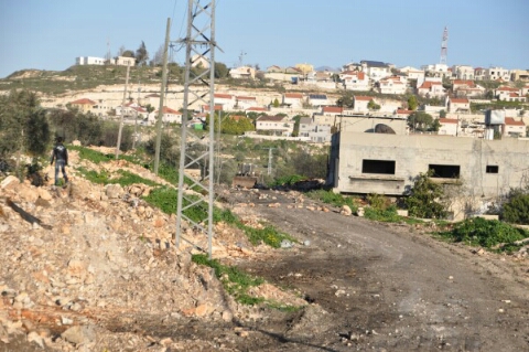 Buldozer militari israeliani entrano nel villaggio. L'insediamento Kedumim sullo sfondo. Photo credit: ISM