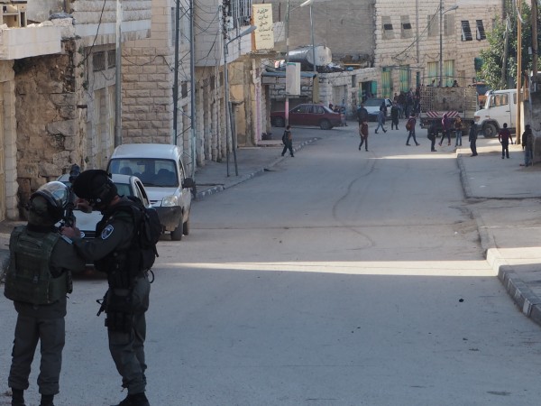 Come se il dominio delle forze israeliane sopra le pietre gettate dai bambini non è già evidente nell’estremo squilibrio di forza mostrato, soldati israeliani in assetto di guerra si precipitano al di là del punto di controllo nella strada della scuola occupata. Agitando i fucili in un tentativo di spaventare eventuali passanti innocenti, i soldati si dirigono verso la scuola palestinese, posizionandosi con attenzione per l’angolo ottimale di tiro, il comandante israeliano della unità insegna a un soldato come armeggiare e come caricare il fucile di assalto con gas lacrimogeni, poi procede a sparare verso donne e bambini. I gas lacrimogeni riempiono ben presto la strada e lasciano molti bambini in età scolare e le loro famiglie che li proteggevano con fatica a vedere e