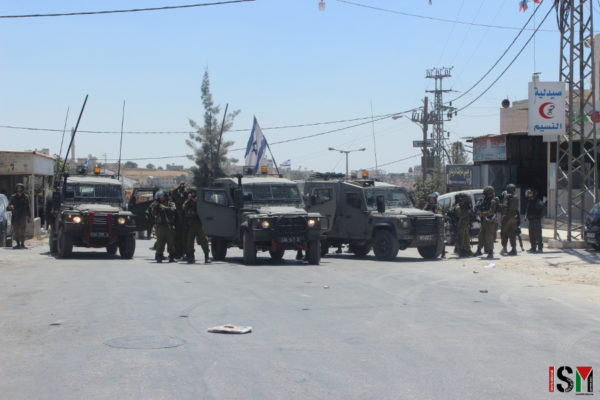 Le jeep dell’esercito israeliano bloccano la strada, puntando le loro armi e scattando fotografie dei dimostranti.
