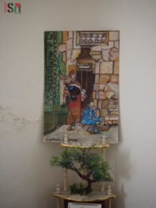 La strada per casa sua è difficile da trovare dato che l’esercito israeliano ha bloccato il passaggio principale dopo la morte di suo marito, un caro amico dell’ISM, nel 2015. Saliamo sulla collina da Shuhada Street, svuotata della normale vita palestinese molto tempo fa dall’occupazione, poi troviamo la strada su un vicolo, poi una breve arrampicata su alcune rocce, attraverso un uliveto, e troviamo la porta alla bella casa di Nisreen. È un’artista, che usa i pastelli ad olio per esprimere i suoi sentimenti riguardo all’occupazione della Palestina e alla violenza che vede intorno a sé. Alcune delle sue immagini sono tristi e alcune sono celebrative, mostrando immagini di donne aggrappate ai loro ulivi di fronte ai carri armati israeliani, che protestano contro l’occupazione. Direttamente dietro la sua casa su per la collina c’è l’insediamento israeliano di Tel Rumeida, che getta una lunga ombra su Nisreen e la sua famiglia. Poiché l’esercito ha chiuso l’accesso normale verso casa sua dalla strada, questo percorso inquieto è l’unico modo per Nisreen e i suoi figli di spostarsi da e per la casa. Ci sistemiamo da Nisreen e ammiriamo le sue opere d’arte che decorano le pareti e il tavolo mentre ci racconta la sua storia.