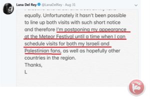 BETLEMME (Ma’an) – Un’ondata di cancellazioni ha seguito l’annuncio di Lana Del Rey di annullare la sua esibizione al Meteor Music Festival nel nord di Israele questo fine settimana.