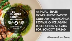 Round Tables fa parte delle attività “gastro-diplomatiche” del governo israeliano, volte a distogliere l’attenzione dal furto di Israele della terra palestinese e delle risorse alimentari.