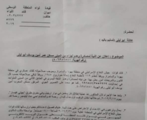 Fonti dei media a Salfit hanno detto che i soldati hanno consegnato ai genitori di Omar Abu Laila, 19 anni, un ordine militare per informarli che la loro casa sarà demolita e che hanno tempo fino al 31 marzo per appellarsi alla decisione.