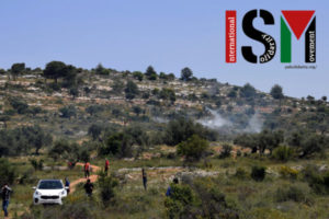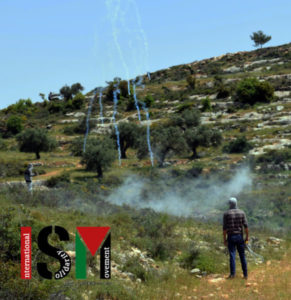 I militari israeliani hanno continuato a sparare lacrimogeni contro la folla per impedire loro di risalire la collina, che è giustamente e legalmente la terra dei manifestanti. Durante l’attacco i coloni israeliani illegali furono visti in cima alla collina. E poco dopo un drone è stato visto librarsi in aria sopra i manifestanti, possibilmente facendo foto.