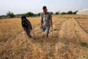 27-year-old Sohaib Qudeh, injured during the Gaza Great March of Return protests, seen on his family field in the southern Gaza city of Khan Younis, in June 2019 [Loai el-Agha / Middle East Monitor]