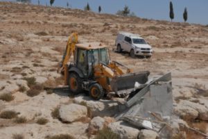 Alle 9:00, 4 bulldozer ed escavatori, da JCB, Hyundai e Volvo, e un camion da carico Scania, insieme a dozzine di soldati IDF, polizia di frontiera e agenti dell’amministrazione civile sono arrivati ​​nel villaggio di Mufakara, un piccolo villaggio di circa 50 abitanti del clan Hamamda. Sono state demolite 4 strutture e 2 famiglie sfollate, tra cui una vedova, le sue 6 figlie e un figlio. I residenti di Mufakara hanno detto che quest’anno è stata la quinta demolizione nel loro villaggio; una famiglia aveva la sua casa, demolita 3 volte in 9 mesi. Gli agenti dell’amministrazione civile hanno anche tagliato e sequestrato una tubatura dell’acqua che portava l’acqua da At-Tuwani a Mufakara. Questa non è la prima volta che l’amministrazione civile israeliana ha privato gli abitanti dei villaggi di Mufakara dell’accesso all’acqua, un diritto umano fondamentale; Il gruppo israeliano per i diritti umani B’Tselem riferisce che dopo aver avuto acqua corrente per soli 6 mesi, le forze israeliane hanno distrutto e confiscato 6 chilometri di condutture a febbraio di quest’anno. L’IOF ha inoltre sequestrato un’auto di proprietà del Consiglio del villaggio di Massafer Yatta.