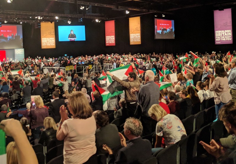 I delegati sventolano bandiere palestinesi alla conferenza annuale del partito laburista nel 2018. Asa Winstanley