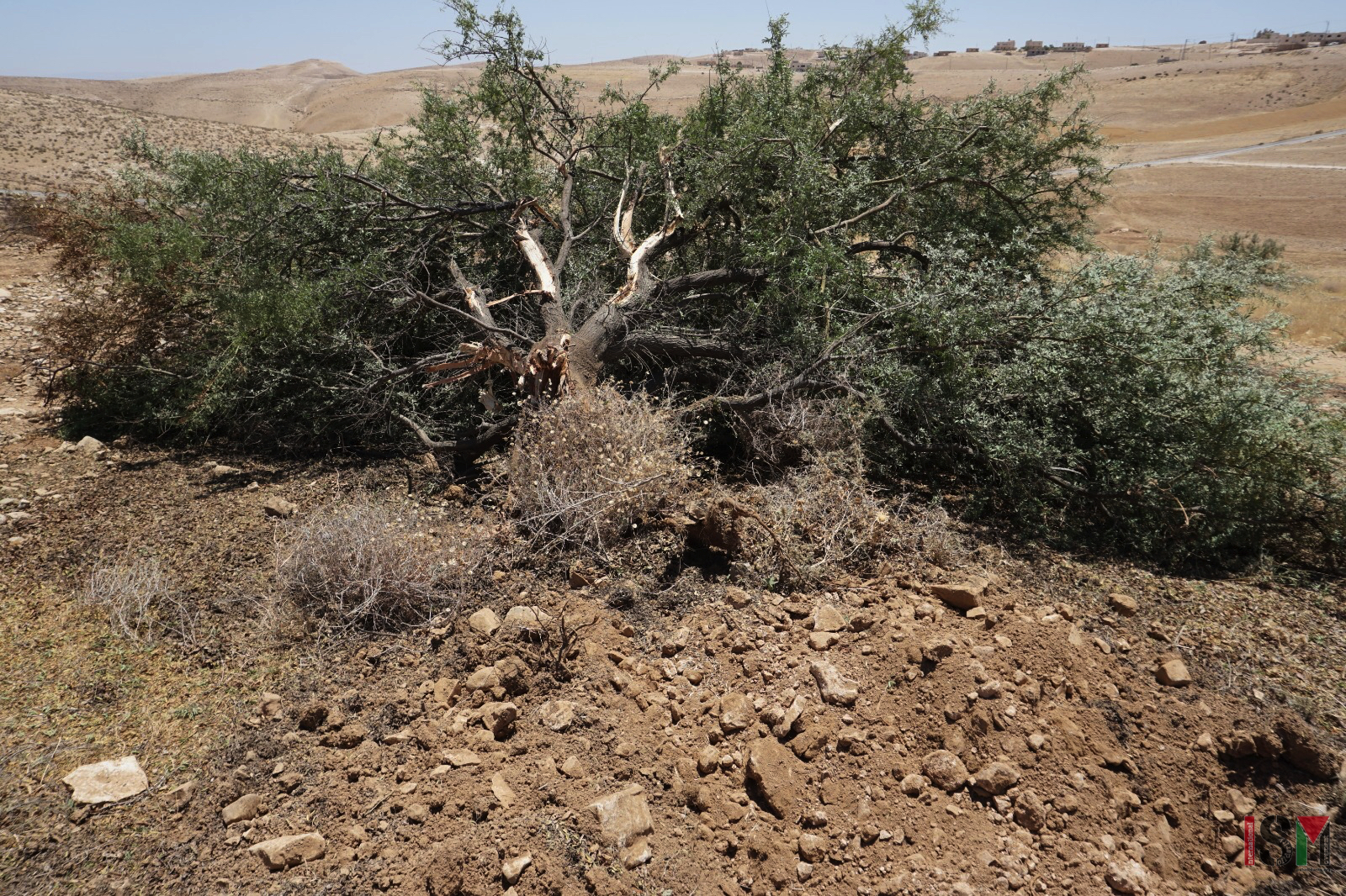 Un ulivo sradicato dalle forze di occupazione israeliane in una riserva naturale vicino al villaggio di Umm al-Khair