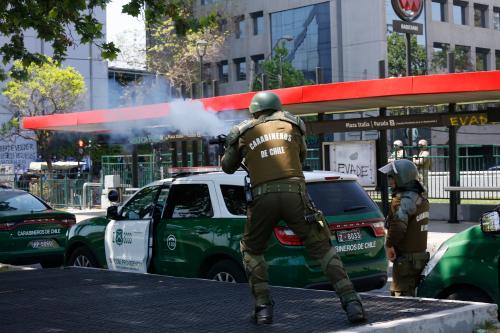 Carbineros del Cile, forze di polizia cilene, intervengono contro i manifestanti di fronte a una stazione della metropolitana il quarto giorno di rivolte sociali per aumenti dei trasporti pubblici a Santiago del Cile il 21 ottobre 2019 [Sebastian Brogca / Anadolu Agency]
