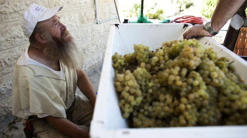 Il viticoltore Gershon Ferency, con uva Chardonnay appena raccolta, nella sua cantina nell’insediamento per soli ebrei di Bat Ayin, a sud di Betlemme – Cisgiordania occupata [Nir Elias / Reuters]