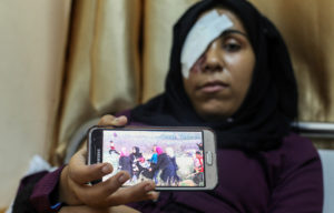 Mai Abu Ruwaida viene ricoverata in un ospedale di Gaza City il 7 dicembre. La 23enne ha perso un occhio dopo essere stata ferita dalle forze di occupazione israeliane durante le proteste lungo il confine orientale di Gaza il giorno precedente. Immagini Mahmoud Ajjour APA