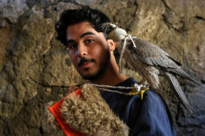 Fadel Nabhein posa per una foto con un falco nella sua casa nel campo profughi di Nuseirat, nella striscia centrale di Gaza, il 9 dicembre. Nabhein alleva e doma falchi e serpenti nella sua casa. Immagini APRA di Ashraf Amra