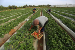 I palestinesi raccolgono fragole in una fattoria a Beit Lahia, nella striscia settentrionale di Gaza, l’11 dicembre. Immagini APRA di Ashraf Amr