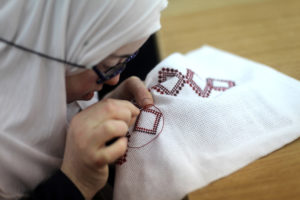 Una donna palestinese con sindrome di Down lavora al ricamo a punto croce nell’associazione Right to Live a Gaza City il 22 dicembre. Immagini Mahmoud Ajjour APA