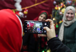 I palestinesi posano per una foto di fronte a un albero di Natale a Gaza City il 26 dicembre. Immagini Mahmoud Ajjour APA