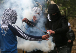 I manifestanti si preparano a restituire un contenitore di gas lacrimogeni sparato dai soldati israeliani durante gli scontri dopo una manifestazione settimanale contro l’espropriazione dei palestinesi nel villaggio di Kfar Qaddum, vicino alla città di Nablus in Cisgiordania, il 27 dicembre. Immagini APA di Shadi Jarar’ah