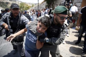 Le guardie di frontiera israeliane trattengono un giovane palestinese durante una manifestazione davanti alla Porta dei Leoni, un ingresso principale del complesso della moschea di Al-Aqsa, a causa delle misure di sicurezza recentemente implementate dalle autorità israeliane che includono metal detector e telecamere, nella Città Vecchia di Gerusalemme il 17 luglio, 2017.