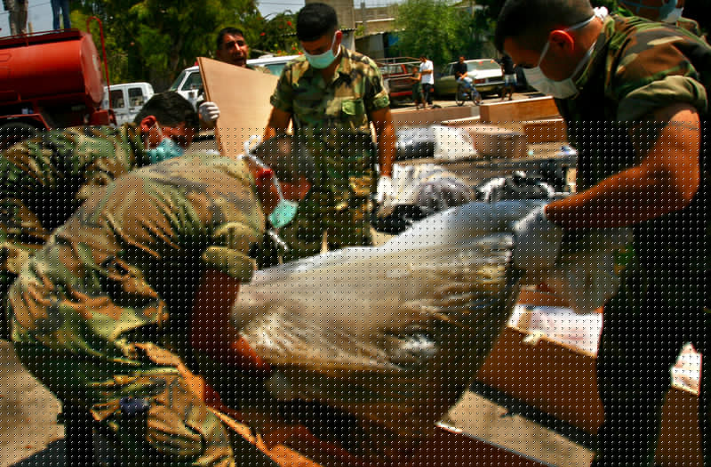 I soldati dell’esercito libanese trasportano sacchi di plastica carichi di corpi di civili uccisi negli attacchi aerei israeliani, Tiro, Libano, 2 agosto 2006. I funerali di almeno 95 civili che si sarebbero svolti quel giorno furono rimandati poiché l’area rimase sotto pesanti bombardamenti israeliani. Nikos Pilos ZUMA Press
