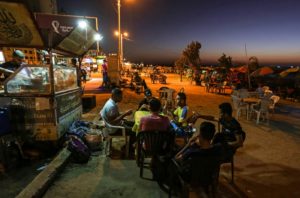 Giovani palestinesi giocano a carte insieme accanto a una bancarella di bevande lungo una passeggiata sulla spiaggia di Gaza dopo il tramonto (AFP)