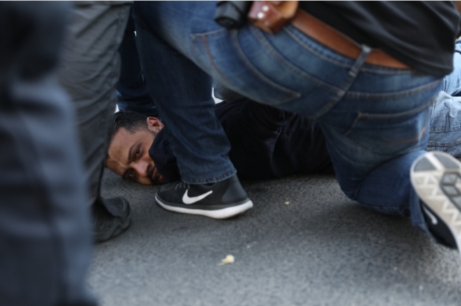 La polizia israeliana arresta un manifestante palestinese fuori dalla nuova ambasciata americana a Gerusalemme. 14 maggio 2018. (Oren Ziv / Activestills.org)