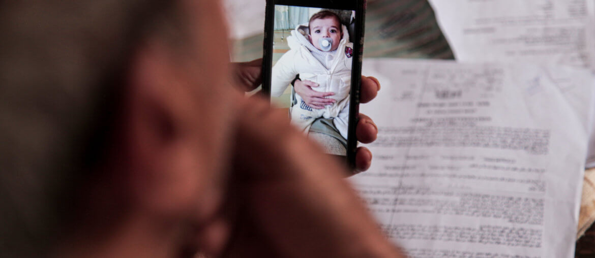 Jehad Yaghi raccoglie un’immagine di suo nipote, Yaghi Omar di nove mesi- dal momento che questa ultima settimana a Gaza l’Autorità Palestinese ha congelato i permessi di uscita per i Palestinesi che cercano un trattamento medico in Israele o in West Bank (Foto: Mohammed Salem)