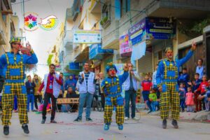 “Ogni venerdì, un team di artisti della performance insieme a terapisti noti come” Joy Team “si recano in diversi campi profughi per intrattenere bambini e famiglie e portarli in strada per giochi, teatro di strada, clown e danza. È un’iniziativa di costruzione della comunità sviluppata per contrastare il trauma e si è dimostrata molto popolare. ”