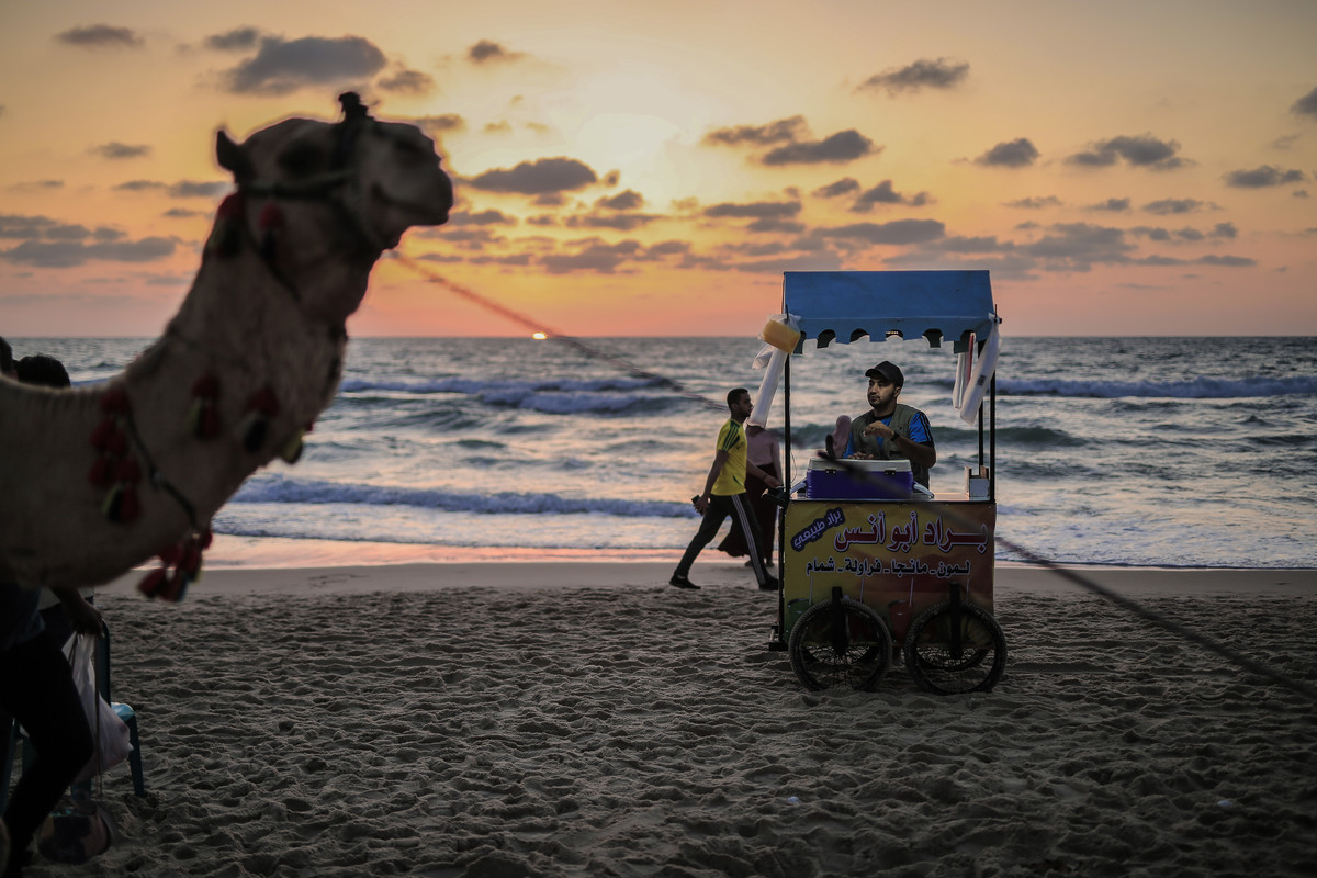 Il sole tramonta sul mare dietro un venditore sulla spiaggia di Gaza