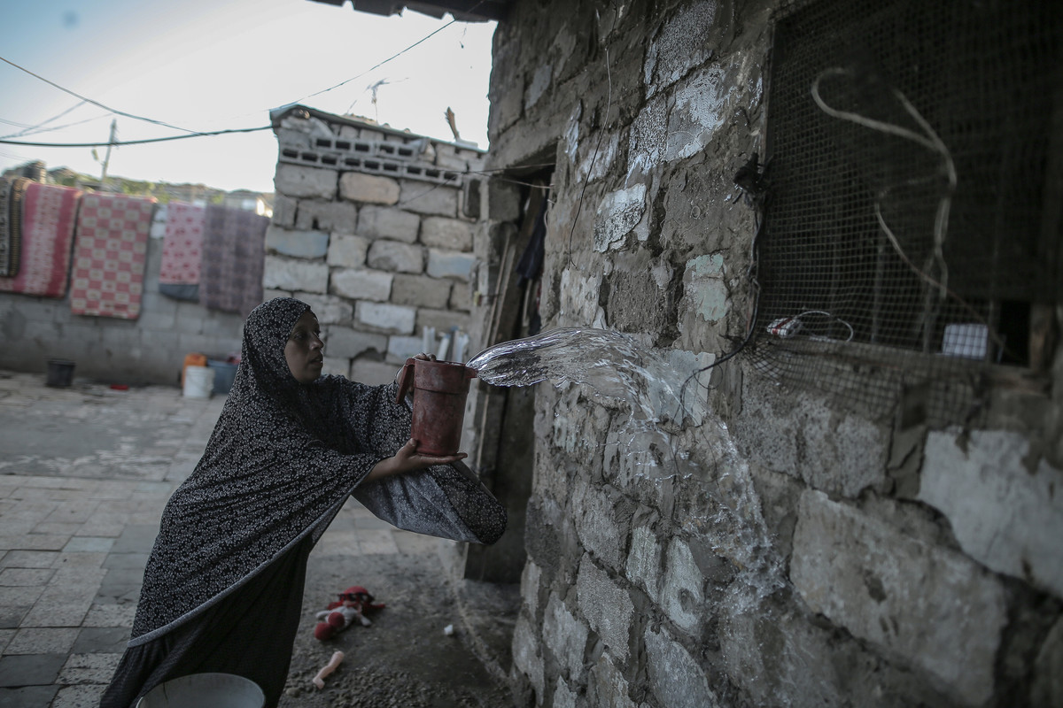 Salwa Abu Nimer getta acqua sul muro della sua casa nel tentativo di mantenere fresca l’abitazione. Sanad Latefa