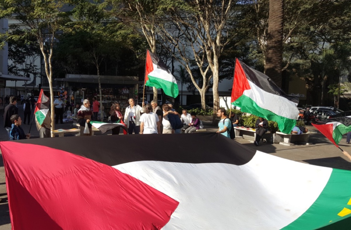 Una protesta contro la chiusura israeliana della moschea di Al-Aqsa per la prima volta dal 1967, a San Paolo, in Brasile, il 28 luglio 2017 [Eman Abusidu]
