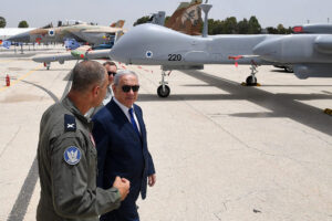 Il primo ministro Benjamin Netanyahu incontra il comandante della base, il generale di brigata Peleg Niago, durante una visita alla base dell’aeronautica di Tel Nof per incontrare i comandanti delle forze aeree straniere, 23 maggio 2018 (Kobi Gideon / GPO)