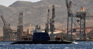 Un sottomarino israeliano atterra nella baia di Eilat per una manovra della Marina israeliana, dopo aver attraversato il Canale di Suez, il 5 luglio 2009. (Yehuda Ben Itah e Moshiko Azulay / Flash90)