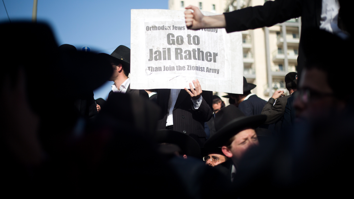 ultra-Orthodox Jews block a main road during a protest against Israeli army conscription, in Jerusalem, Thursday, Oct. 19, 2017. Israeli police say they have arrested 40 people in protests by a fringe group within Israel’s ultra-Orthodox Jewish community. (AP Photo/Ariel Schalit)