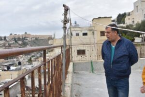 Un uomo guarda fuori da un balcone con una recinzione arrugginita: Zuheir Rajabi guarda il suo quartiere. Teme che lui, come molti dei suoi vicini, dovrà presto affrontare ordini di sfratto da un tribunale israeliano.