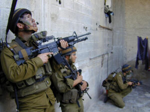 Soldati israeliani nel campo profughi di Jenin, una città nella Cisgiordania occupata, 20 aprile 2002 (unità del portavoce dell’IDF / CC BY-SA 3.0)