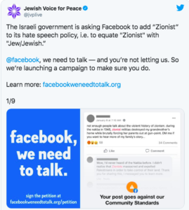 La campagna, intitolata “Facebook, we need to talk”, è stata lanciata in risposta agli sforzi delle organizzazioni sioniste, sostenute dal governo israeliano, di convincere Facebook a considerare la parola “sionista” come sostitutiva di “ebreo”. Facebook sta valutando se i post di natura critica sulla piattaforma che utilizzano il termine “sionista” “rientrino nella categoria dell’incitamento all’odio secondo gli standard della comunità di Facebook”, ha detto Jewish Voice for Peace (JVP) in una dichiarazione rilasciata mercoledì, aggiungendo che Facebook potrebbe prendere una decisione entro la fine di febbraio.