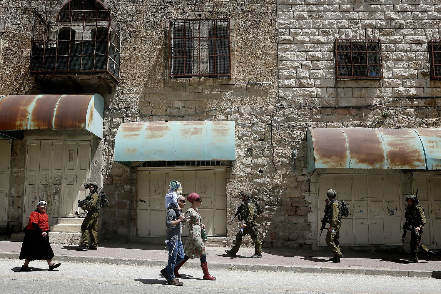 Soldati israeliani che pattugliano su Shuhada Street nella città di Hebron, in Cisgiordania, mentre centinaia di ebrei ortodossi arrivano per pregare alla Grotta del Patriarca, durante la festa ebraica della Pasqua ebraica. 16 aprile 2014 (Miriam Alster / Flash90)