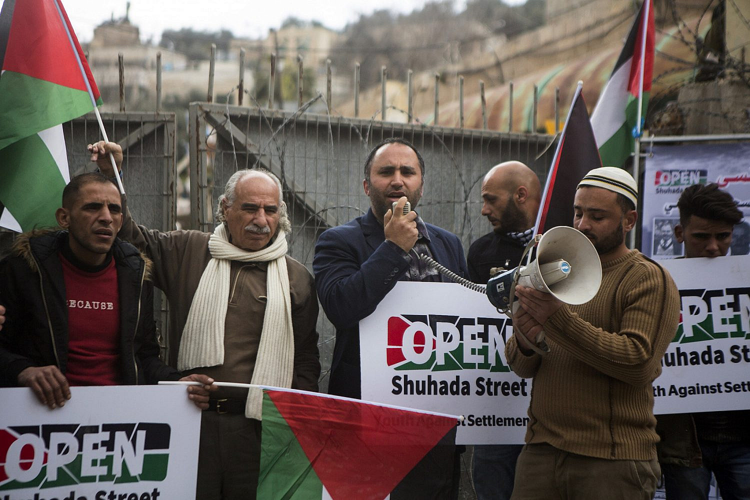 Issa Amro tiene un discorso durante una manifestazione che commemora il massacro della Moschea Ibrahimi del 1994 e chiede l’apertura di Shuhada Street, Hebron, West Bank, il 20 febbraio 2019. (Activestills)
