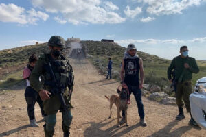 Quella mattina, mentre mi trovavo di fronte all’avamposto, un colono è uscito da una delle roulotte con un cane. L’ho riconosciuto subito. Questo è lo stesso colono che vive nell’avamposto di Havat Ma’on, che è stato costruito sulle terre della mia comunità. Questo è stato lo stesso colono che nel novembre 2019 mi ha aggredito con il suo cane e mi ha ferito una mano. È successo mentre stavo documentando un attacco a una famiglia palestinese che stava raccogliendo olive. Lui e altri cinque coloni hanno lanciato pietre contro la famiglia. Mentre riprendevo l’attacco, il cane mi ha morso la mano dopo che il colono lo aveva incitato contro di me.