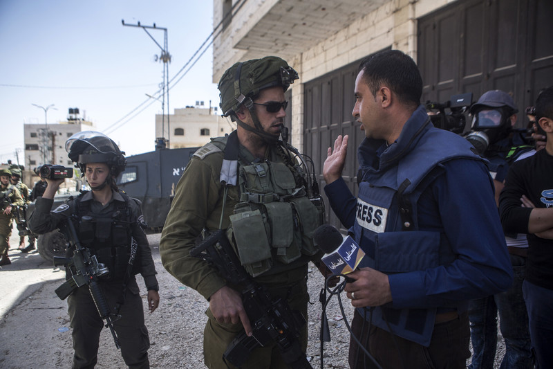 Un soldato israeliano molesta un giornalista palestinese durante una manifestazione in solidarietà con la Grande Marcia del Ritorno nella città di Hebron in Cisgiordania nell’aprile 2018. Anne Paq ActiveStills