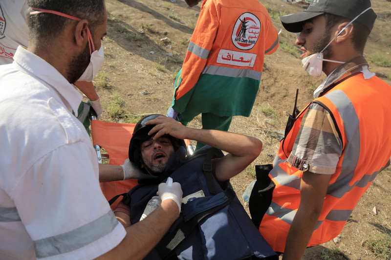 I medici evacuano un giornalista ferito durante le proteste della Grande Marcia del Ritorno a est di Gaza City nel giugno 2018. Mohammed Zaanoun ActiveStills