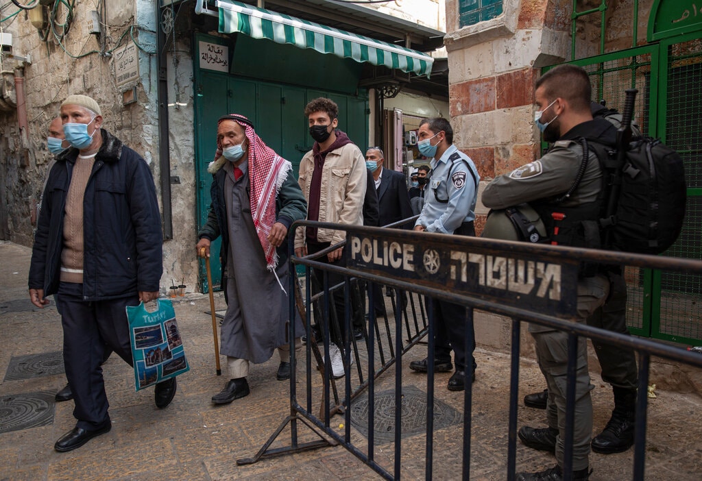 Palestinesi che passano davanti agli agenti di polizia israeliani dopo le preghiere del venerdì a Gerusalemme. Human Rights Watch afferma che le politiche a favore degli ebrei israeliani rispetto ai palestinesi persistono nei territori occupati e in Israele.