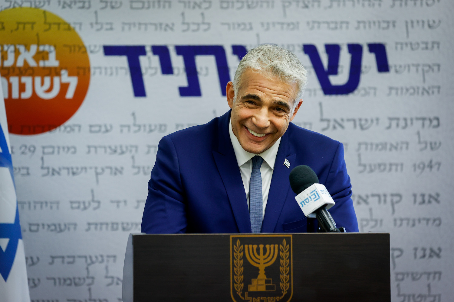 Il capo del partito Yesh Atid Yair Lapid parla durante una riunione di fazione alla Knesset, il 10 maggio 2021 (Yonatan Sindel / Flash90)
