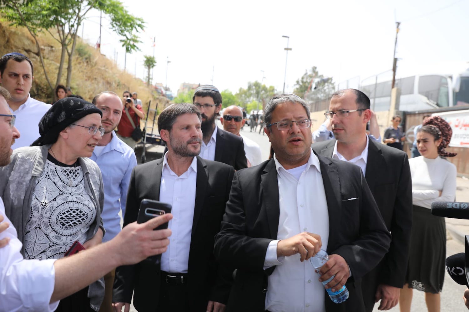 I parlamentari Bezalel Smotrich e Itamar Ben Gvir del Partito Sionista Religioso di estrema destra visitano il quartiere di Sheikh Jarrah a Gerusalemme Est per mostrare sostegno ai coloni che cercano di sfrattare i palestinesi lì, 10 maggio 2021 (Olivier Fitoussi / Flash90)