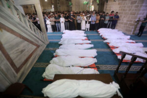 Le persone in lutto pregano sui corpi dei palestinesi uccisi negli attacchi aerei israeliani nella notte a Gaza City il 16 maggio. Atia Darwish APA immagini