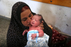 Una donna palestinese conforta un bambino nato in una scuola delle Nazioni Unite a Gaza City dove le famiglie palestinesi sfollate hanno cercato rifugio, il 20 maggio immagini dell’APA di Ashraf Amra