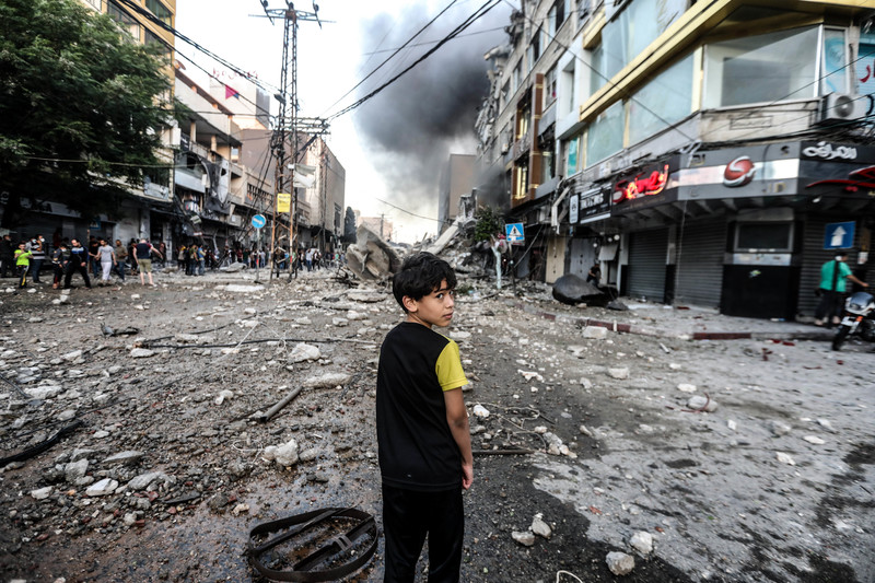 Un ragazzo si trova in una strada cosparsa di detriti con fumo all’orizzonte