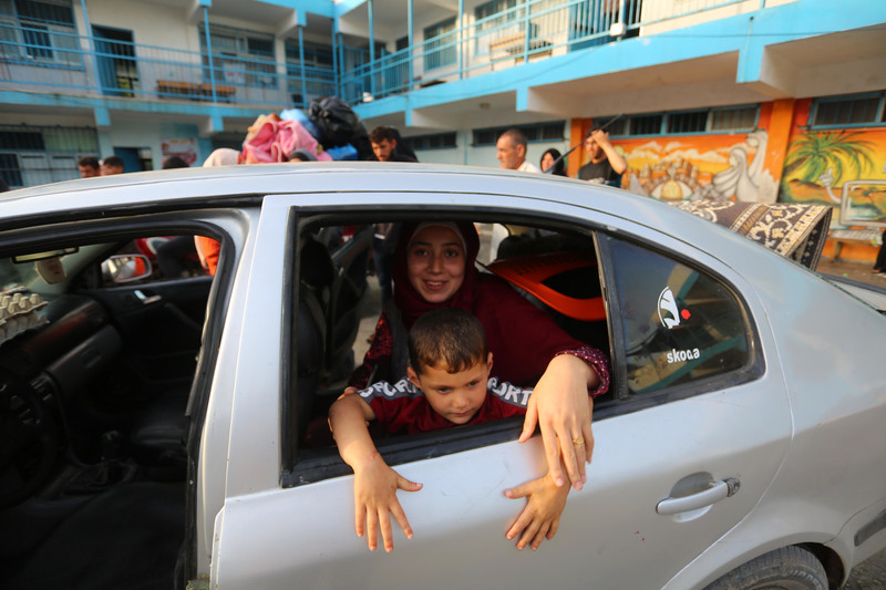 I palestinesi che avevano cercato rifugio in una scuola dell’UNRWA trasportano i loro averi mentre ritornano nei loro quartieri bombardati a Gaza City il 21 maggio. Ashraf Amra APA immagini