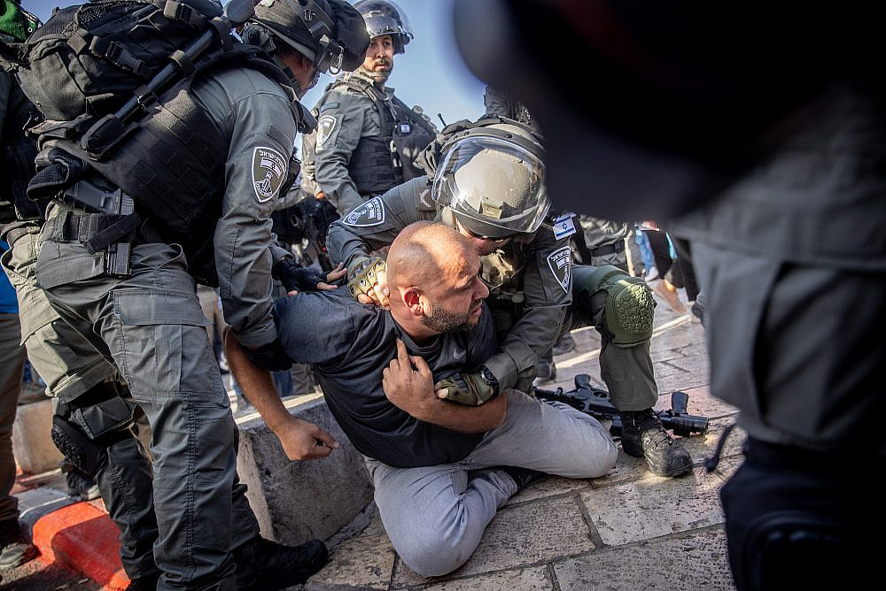 Ufficiali di polizia israeliani durante gli scontri con i manifestanti a seguito di una visita del politico di destra Itamar Ben Gvir alla Porta di Damasco nella Città Vecchia di Gerusalemme, 10 giugno 2021. (Yonatan Sindel/Flash90)