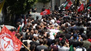 Testimoni oculari hanno detto a Mondoweiss che mentre il corteo si avvicinava al cimitero, le forze israeliane hanno iniziato a sparare contro la folla “dal nulla”, sparando gas lacrimogeni e proiettili di gomma contro le persone.